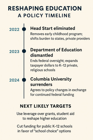 Seen together, the moves from Head Start → K–12 privatization → higher ed pressure are not separate fights — they’re stages of the same campaign.