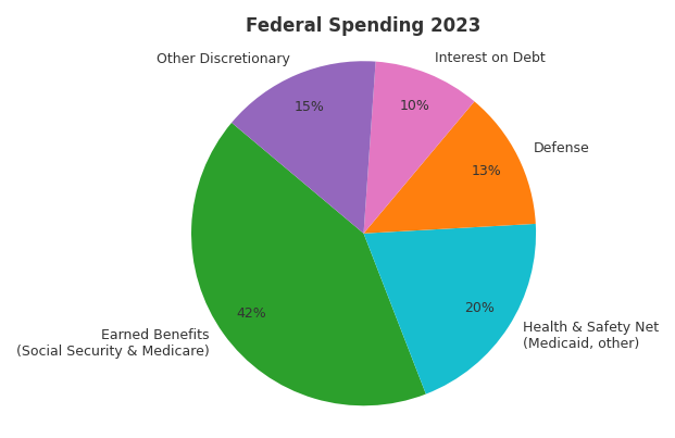 This chart shows how federal dollars were actually spent in 2023. The largest share — “Earned Benefits” like Social Security and Medicare — represents programs workers paid into throughout their lives, not giveaways.