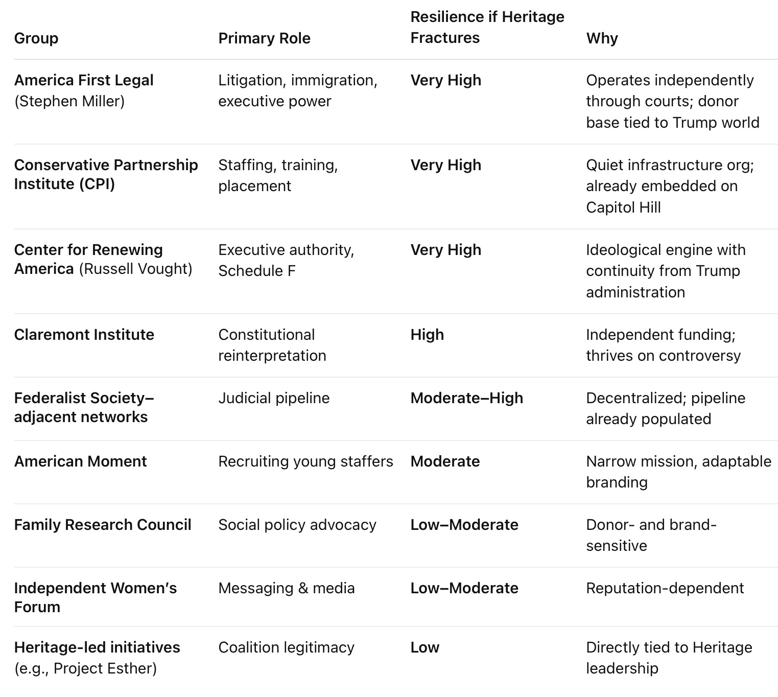 Organizations such as the Federalist Society, America First Legal, and staffing groups linked to Schedule F continue to shape courts and agencies regardless of Heritage’s institutional health. This structure explains why reputational damage weakens legitimacy, but does not dismantle the machinery of governance change.