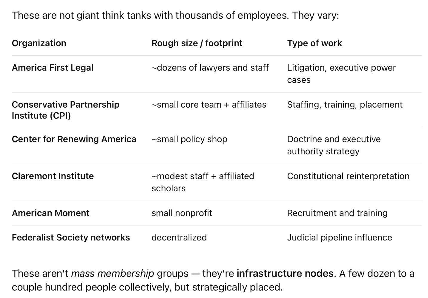 In the next post, I’ll turn to the role of the courts. Understanding the organizations behind Project 2025 explains who is positioned to act; understanding recent Supreme Court decisions explains how that action became possible. Over the past decade, the Court has reshaped administrative law and expanded executive authority in ways that make staffing pipelines and agency control far more consequential than they once were. That legal groundwork is the missing piece in understanding why projects like this can move forward quietly, even amid institutional turmoil.